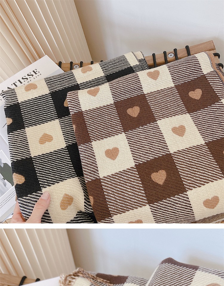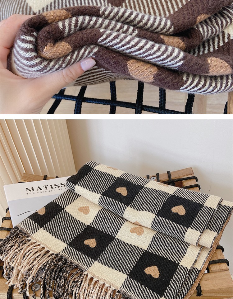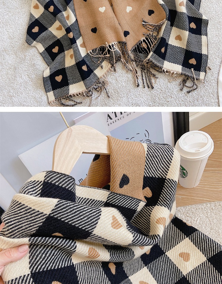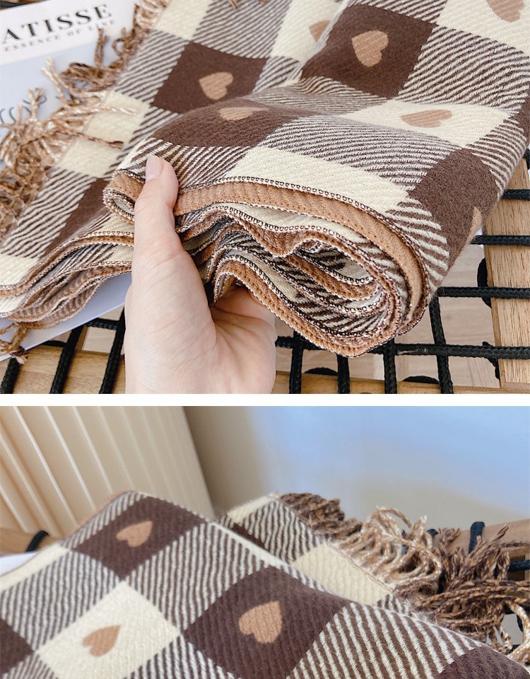 Artificial Cashmere Scarf Female With Hearts Thick Checks Fringe Bib
