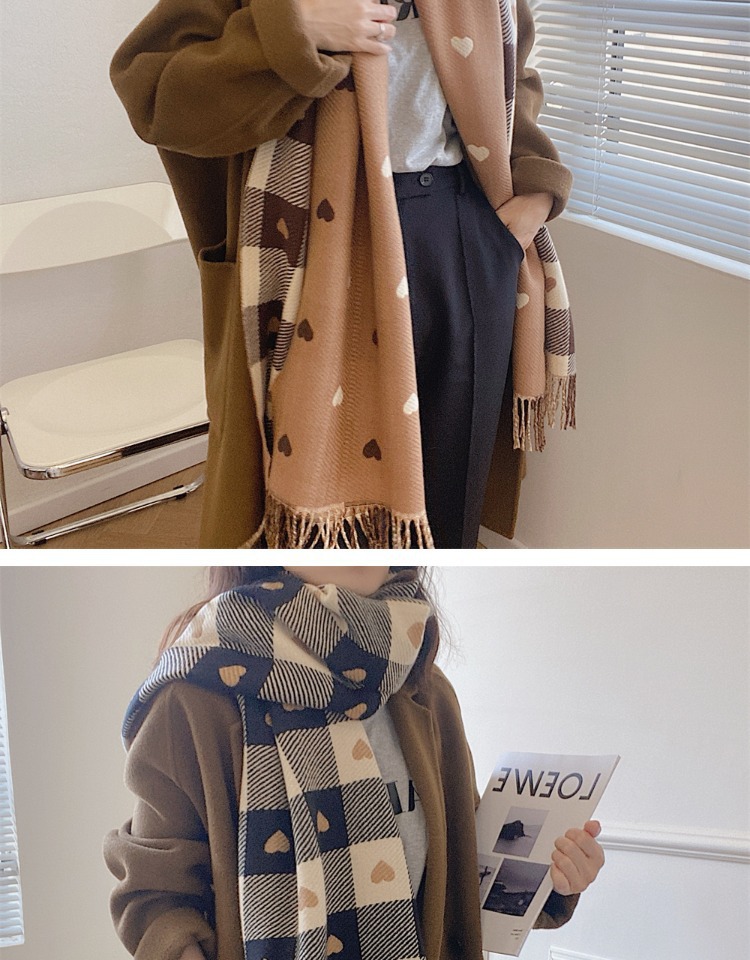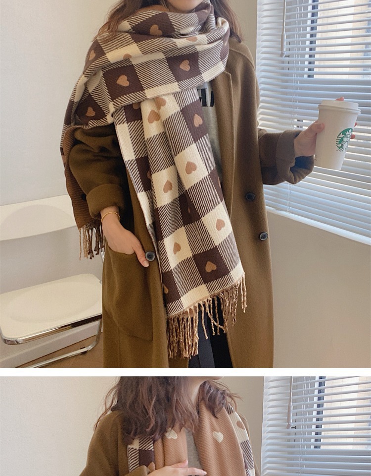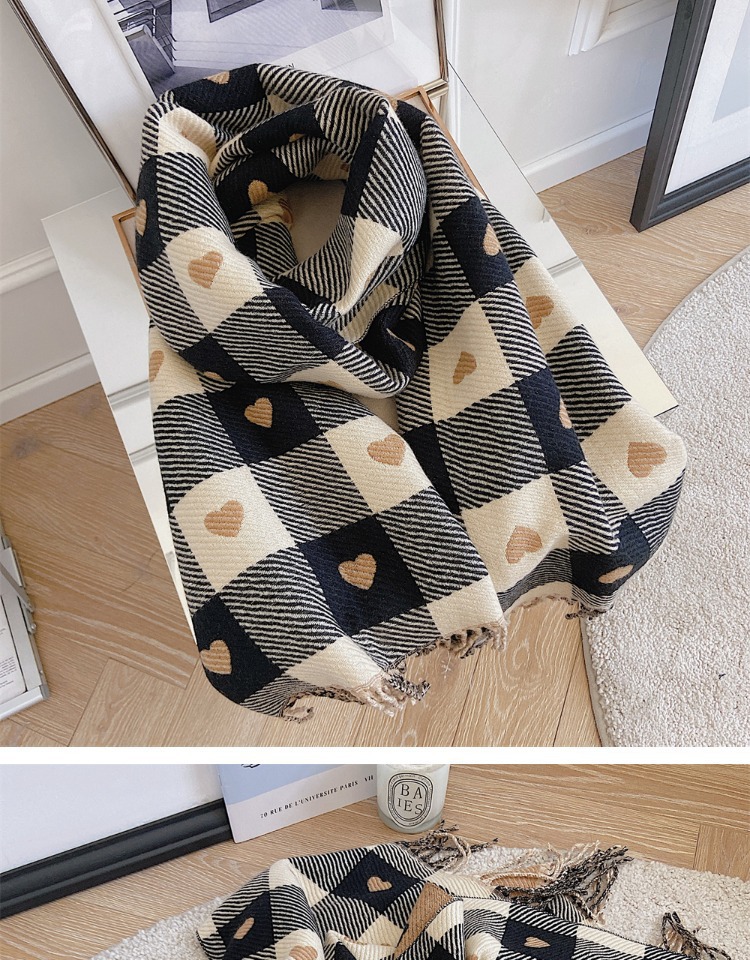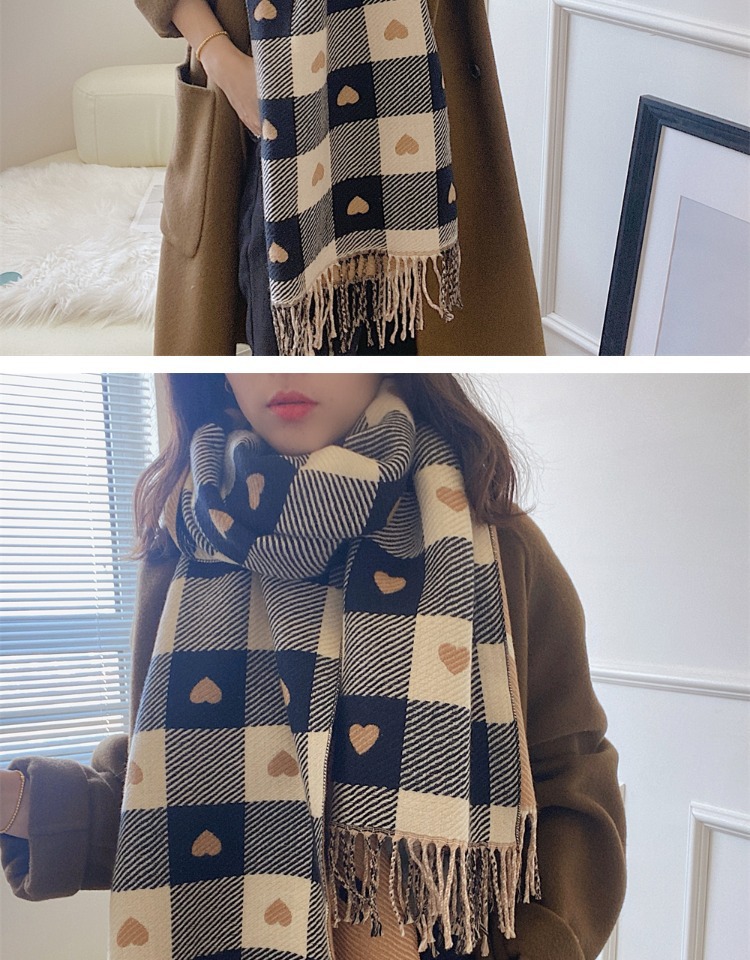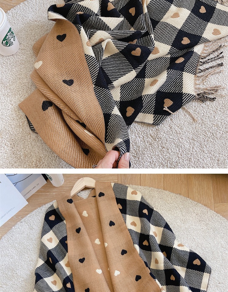 Artificial Cashmere Scarf Female With Hearts Thick Checks Fringe Bib