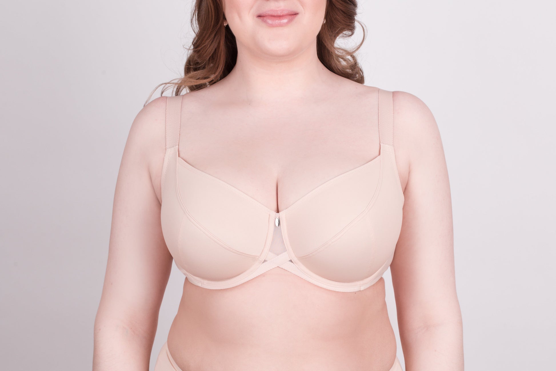Made from elastic knit fabric. The bra with soft underwired cups has triple diagonal segmentation. This design provides a high degree of support due to the lower part of the cup, which performs a shaping function - lifts, gathers from the sides, centers the breast, creating a round shape. A four-row closure allows for perfect adjustment of the bra's volume. The width of the strap tape and side parts of the band varies depending on the size. The larger the size, the wider the strap and side parts.