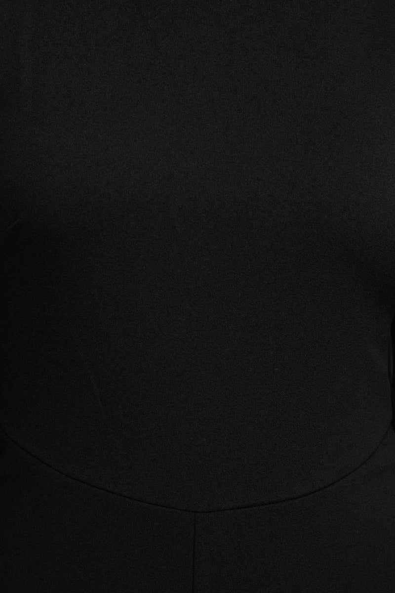 Crafted from a soft and breathable crepe fabric (96% Polyester, 4% Spandex) with a full lining, it moves gracefully while offering a sleek silhouette. The chiffon popover neckline and long sheer sleeves create an airy, layered look that flatters every figure. A concealed zipper at the back ensures a seamless finish, while the tailored pant legs elongate the body for a statuesque feel.