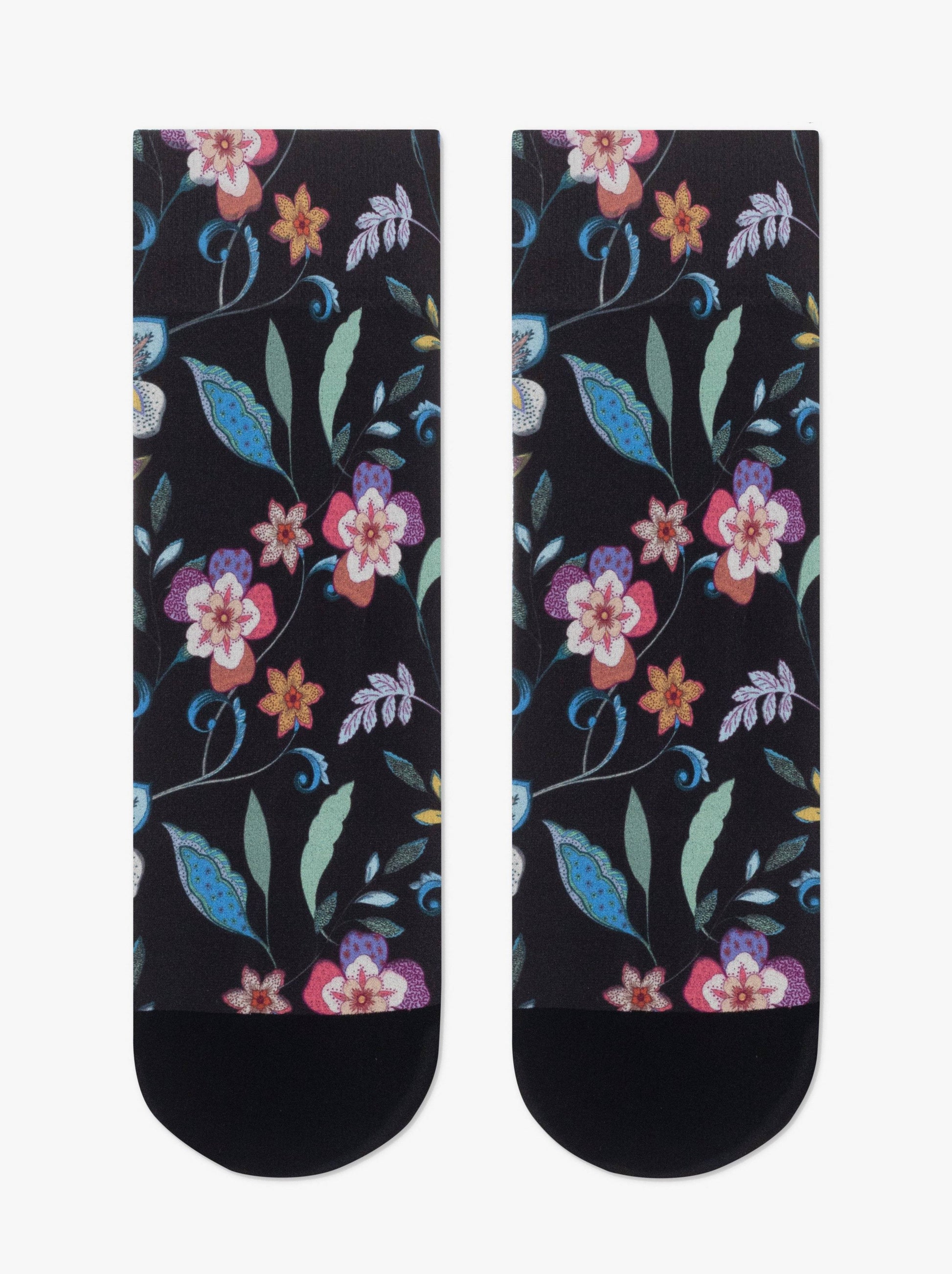 These dense socks FANTASY with a vibrant, long-lasting floral print applied by thermal transfer printing are a bold and stylish accent for everyday outfits. The black toe and minimalist no-heel cut add contrast and individuality.