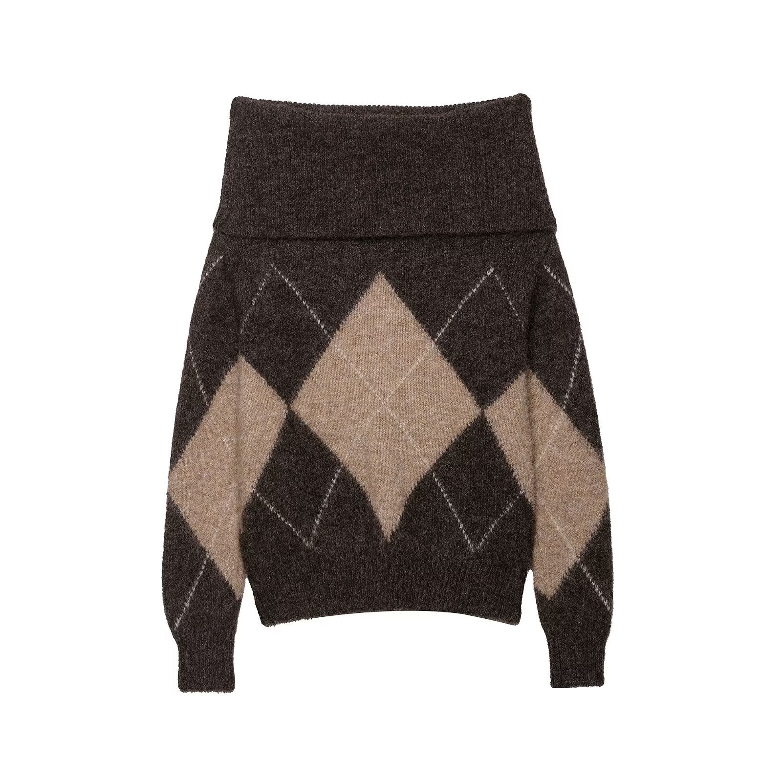 Early Autumn Women Clothing Commuting Casual All Matching Pullover Diamond Pattern Shoulder Baring Sweater Sweater