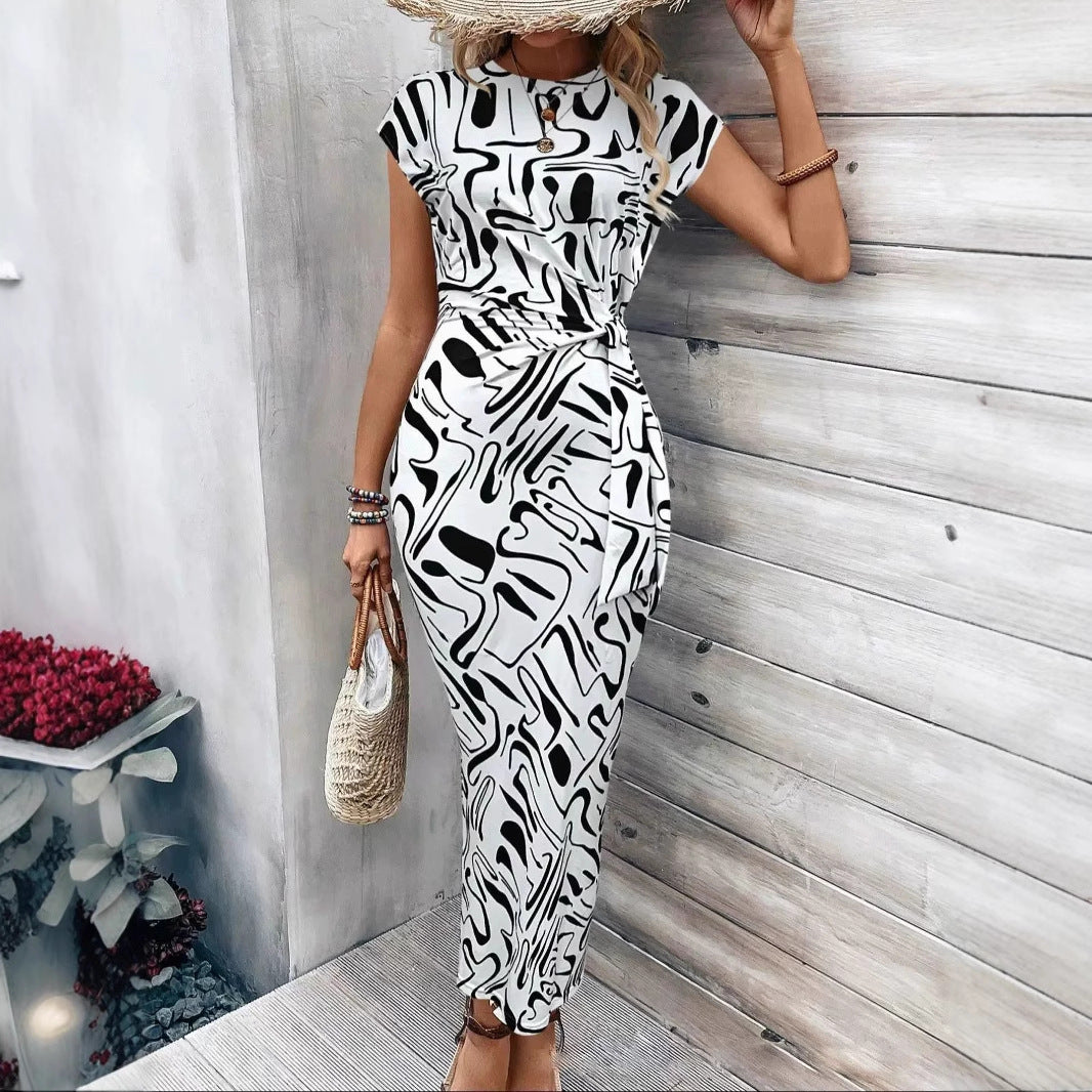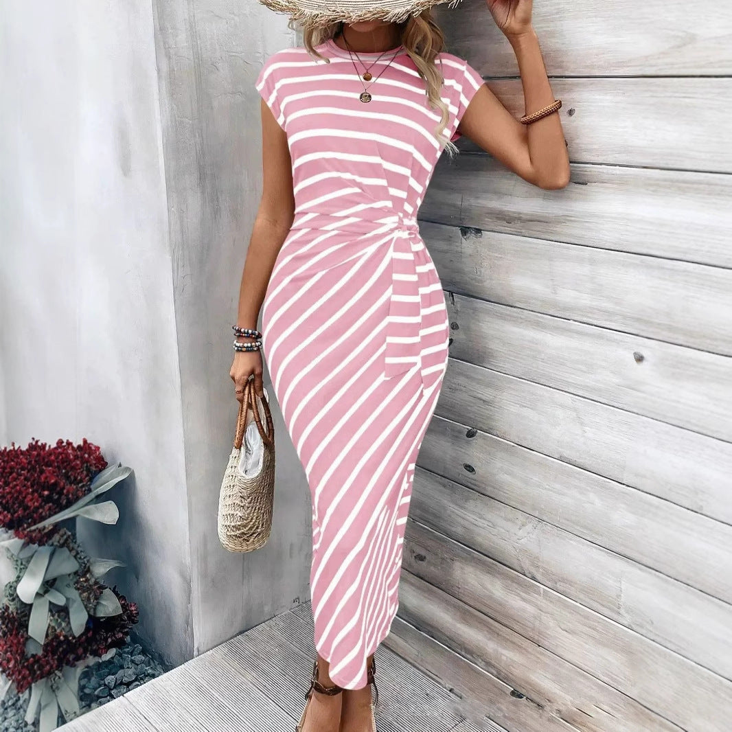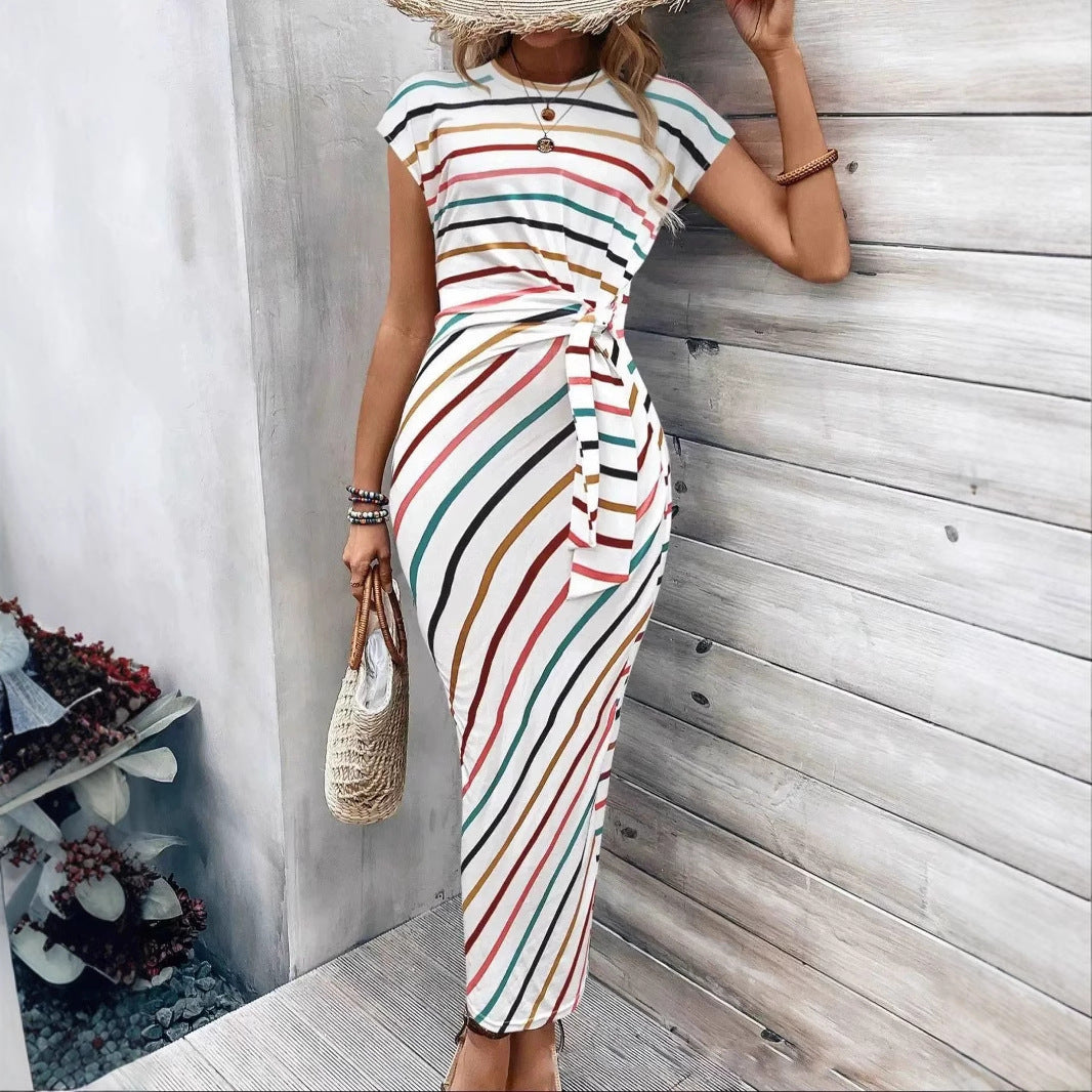 Elegant Waist Strap Striped Round Neck Short Sleeve And Long Pattern Dress