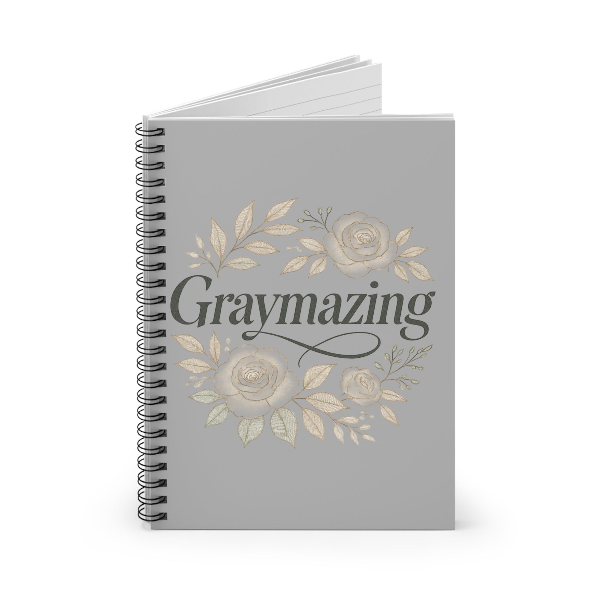 A soft-gray spiral notebook designed for lovers of muted, elegant stationery. The front features a delicate floral wreath in warm neutral tones surrounding hand-lettered “Graymazing,” giving it a calm, sophisticated mood. Inside are 118 ruled pages on smooth 90 gsm paper for comfortable daily writing, journaling, lists, or sketches. A metal spiral lets the notebook lie flat or fold back for easier note-taking, and a handy document pocket inside the back cover keeps receipts, loose notes, or stickers organized. At 6" x 8" it slips into bags without taking up space and reads like a small ritual: open to a quiet page, breathe, and write.