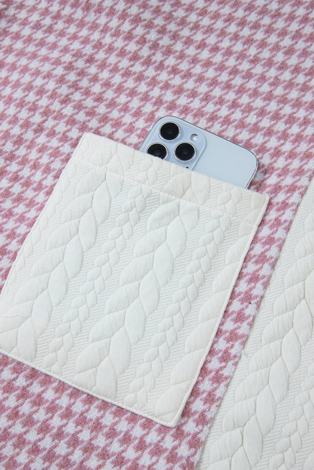 This relaxed shacket blends classic houndstooth patterns with a fresh pop of color for a fun, modern vibe. The textured fabric brings a cozy, touchable feel that makes it stand out. Pair it with your favorite tee and jeans to nail that effortlessly cool layered outfit.
