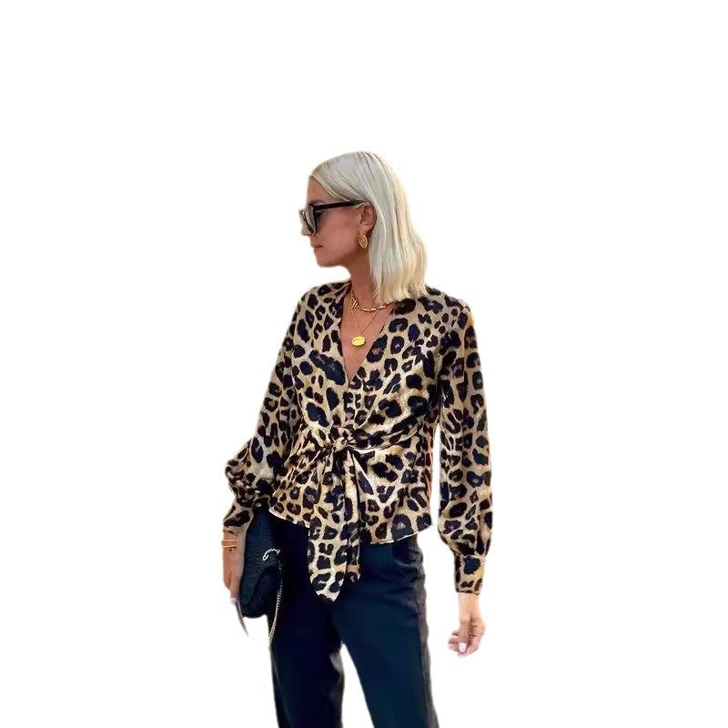 New Leopard-Print Lace-Up V-Neck Elegant Long-Sleeve Shirt