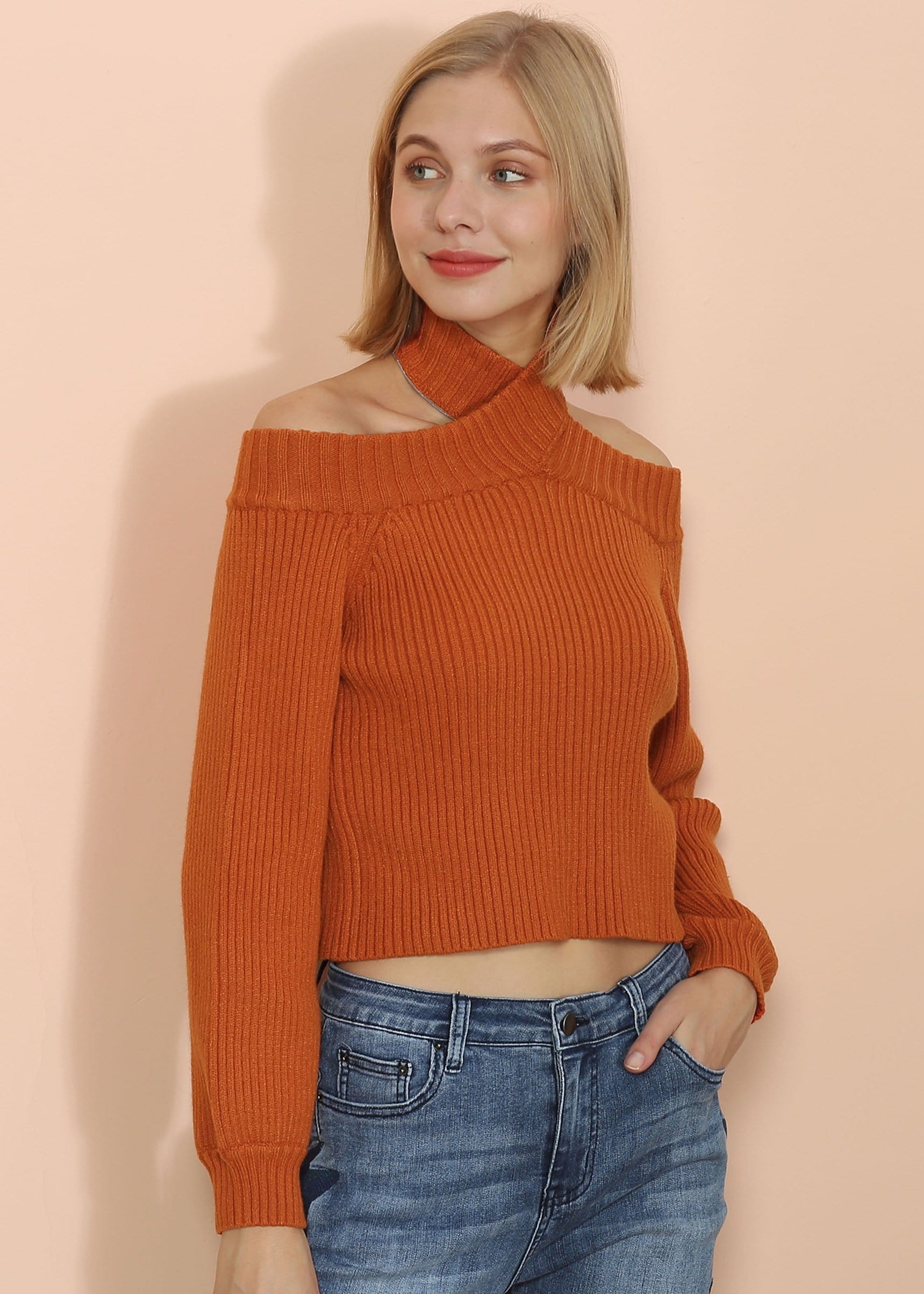 ??he Anna-Kaci sweater is detailed with a flirty turtleneck with cold shoulder neck line. Features solid color, long sleeves, ribbed knit material, and regular fit. Pair it with faded jeans and boots for a beautiful fall look.
