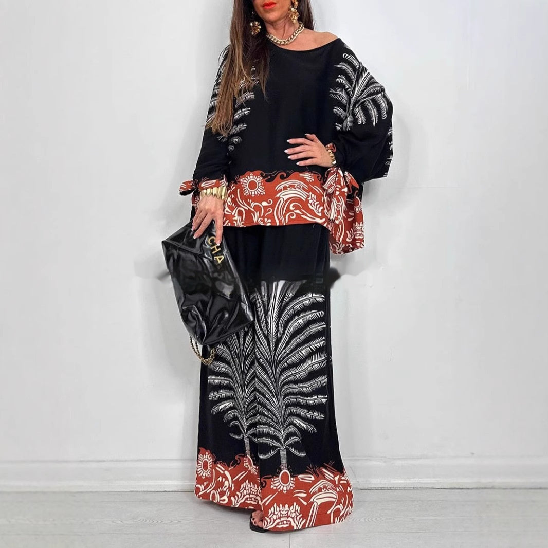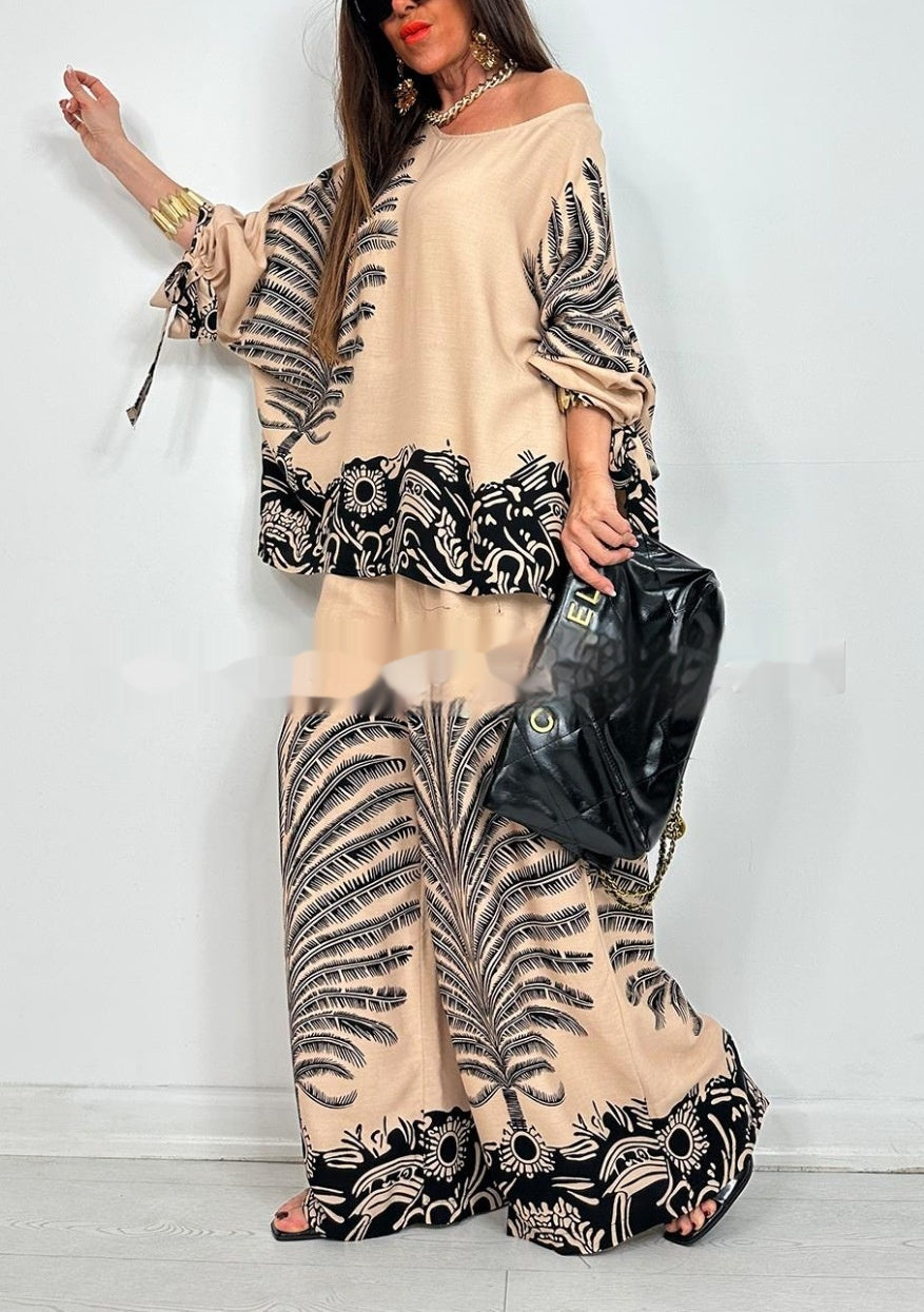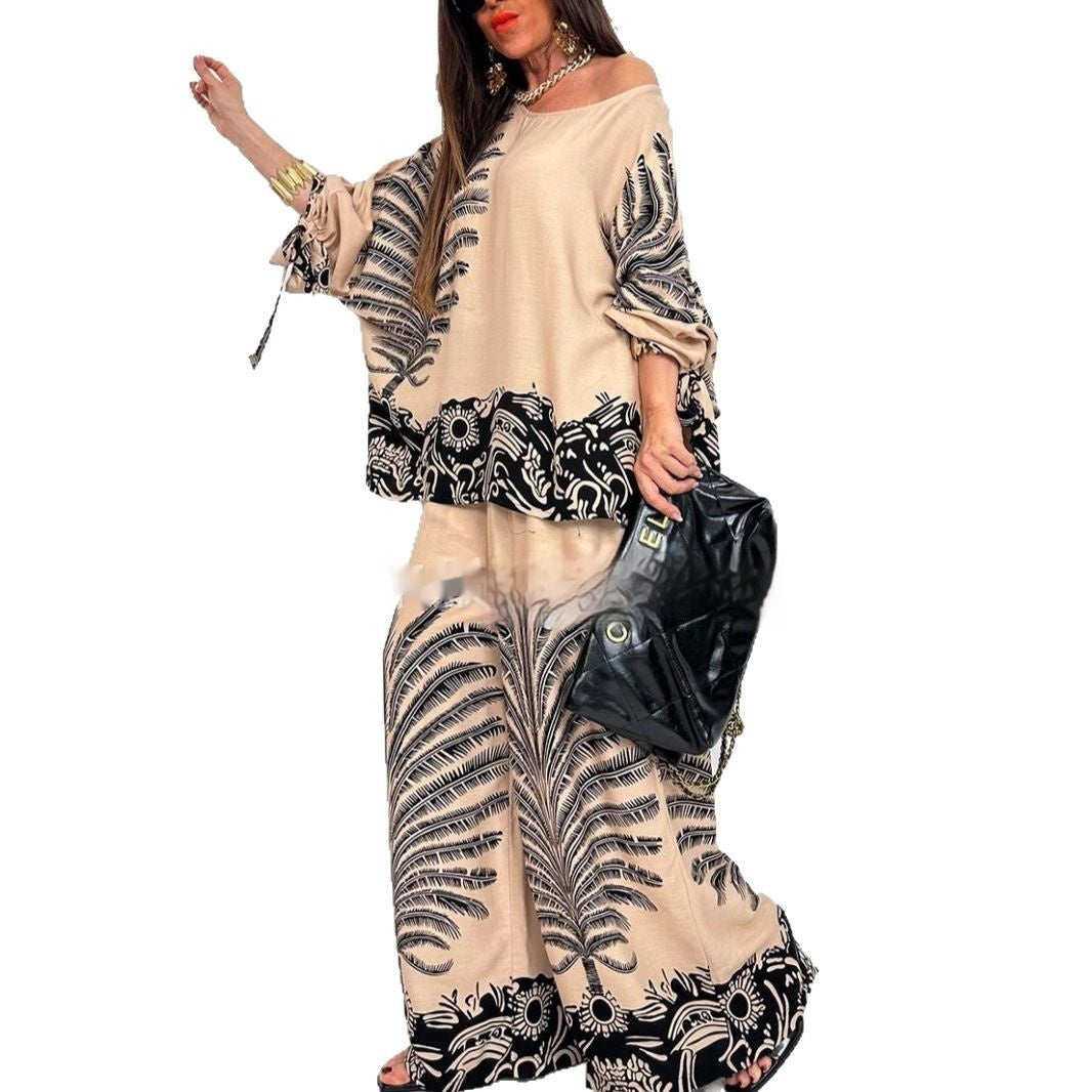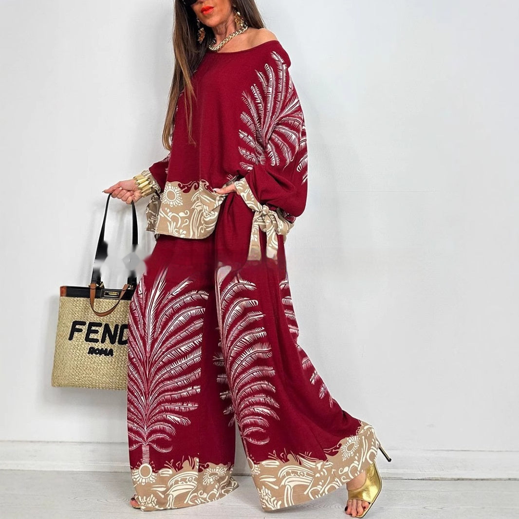 Vintage Floral Print Long Sleeves Top Wide Leg Pants Suit
