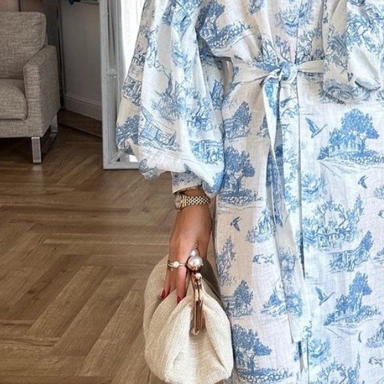 Vintage Ink Print Long Sleeve Cardigan Tied Dress