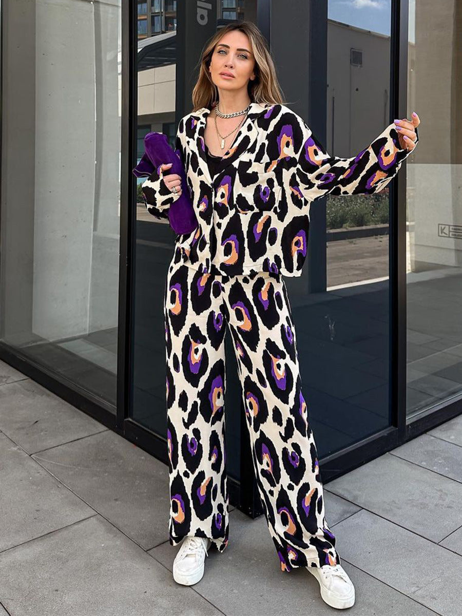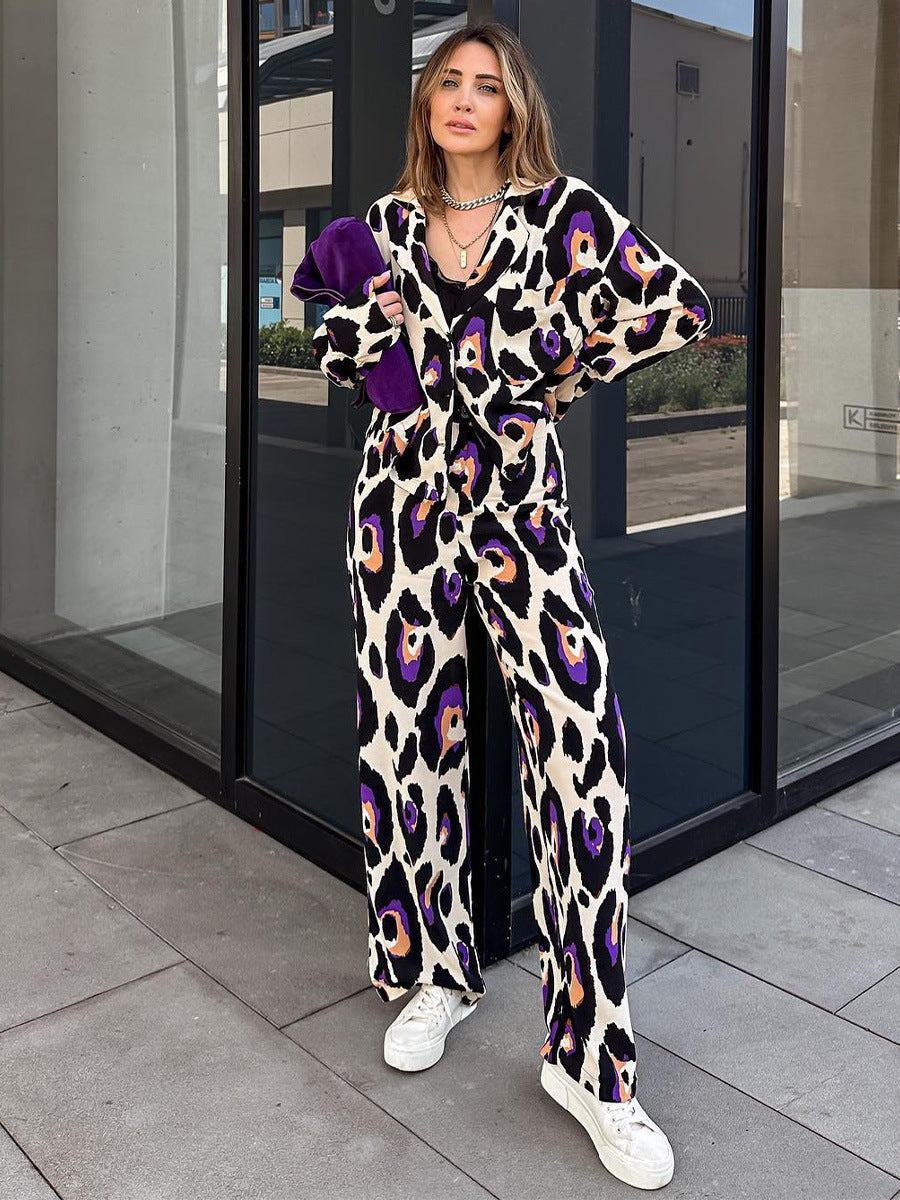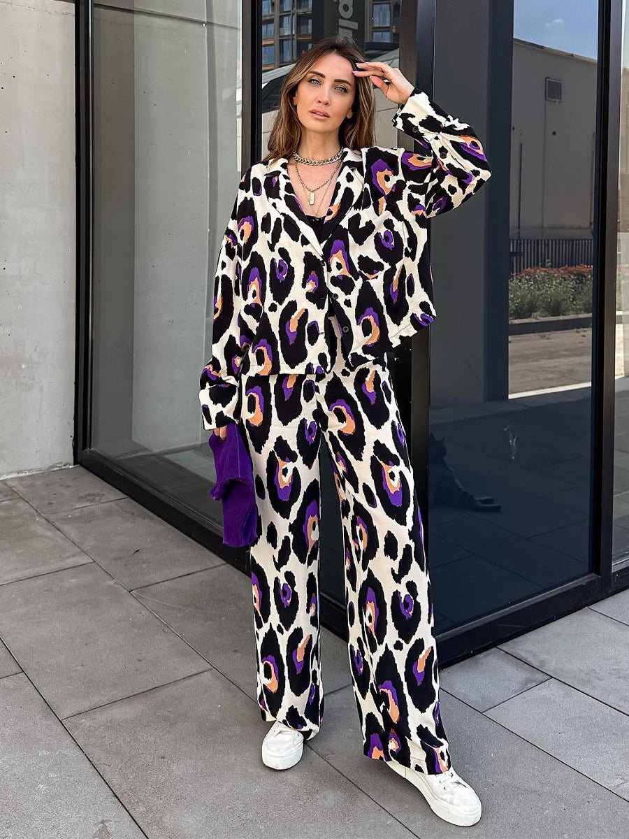 Women's Fashion Casual Printing Suit Collar Short Long Sleeve Top High Waist Wide Leg Pants
