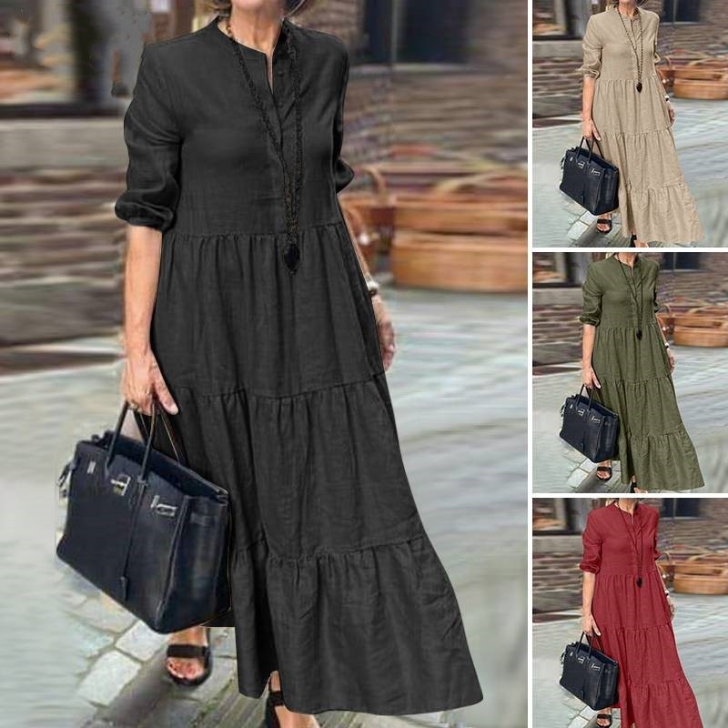 Women's Solid Color Wide Hem Casual Loose Lapel Cotton Linen Long Dress